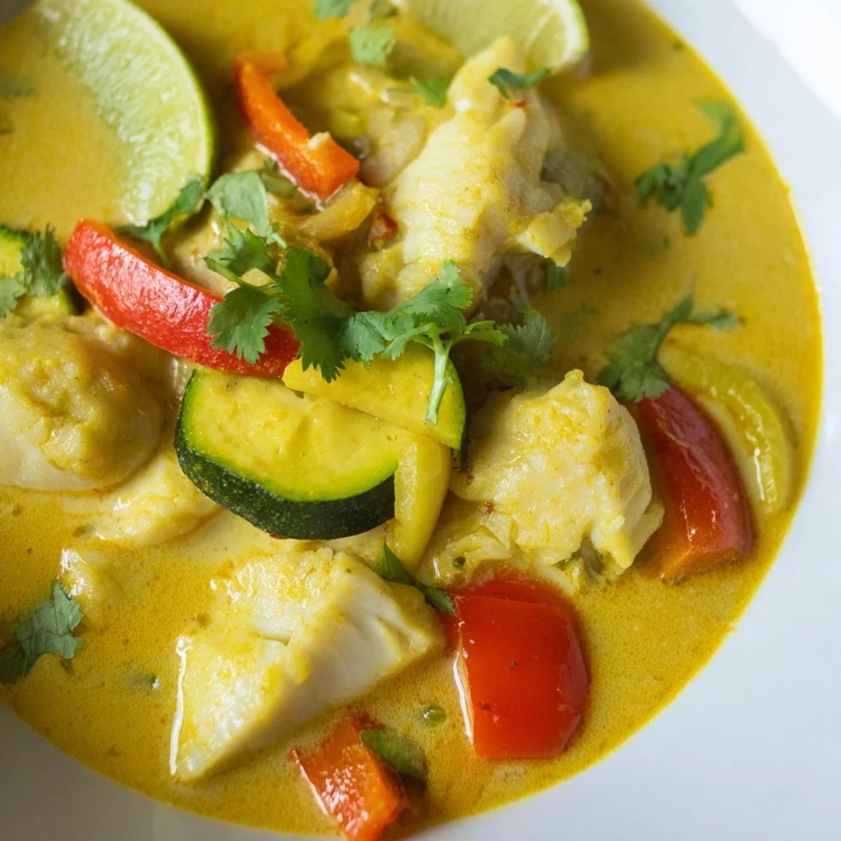 This aromatic stew combines tender chunks of white fish with a luxurious coconut milk base infused with ginger, turmeric, and coriander. Fresh vegetables like bell pepper, carrot, and zucchini add texture while red chilies provide gentle warmth. The fish simmers gently until perfectly opaque, absorbing the fragrant broth. Ready in under an hour, this dairy-free bowl delivers restaurant-quality flavors with minimal effort. Serve with steamed jasmine rice and garnish with fresh cilantro and lime wedges for a complete coastal-inspired meal.