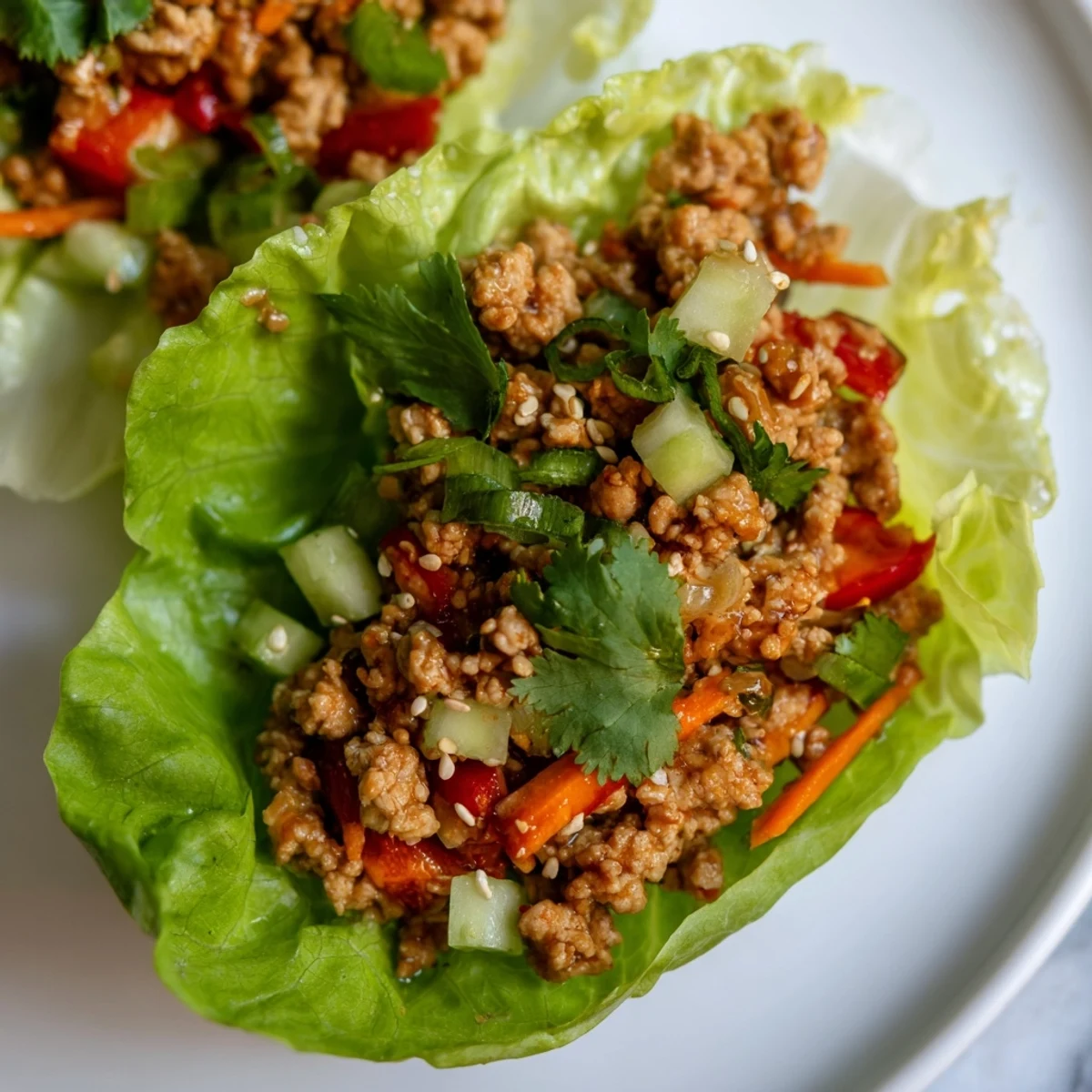 This light and satisfying dish combines lean ground turkey with colorful vegetables like bell peppers, carrots, and cucumbers, all seasoned with a blend of soy sauce, hoisin, rice vinegar, and sesame oil. The mixture gets spooned into crisp lettuce cups and topped with fresh cilantro and toasted sesame seeds for added texture and flavor.