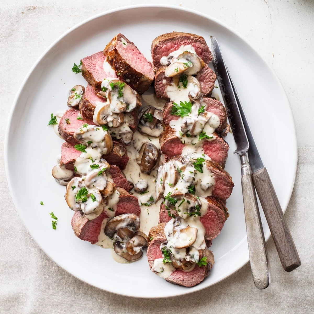 - Slice that rested tenderloin against the grain, arrange on plates, and spoon that glorious mushroom sauce over everything before scattering parsley on top.