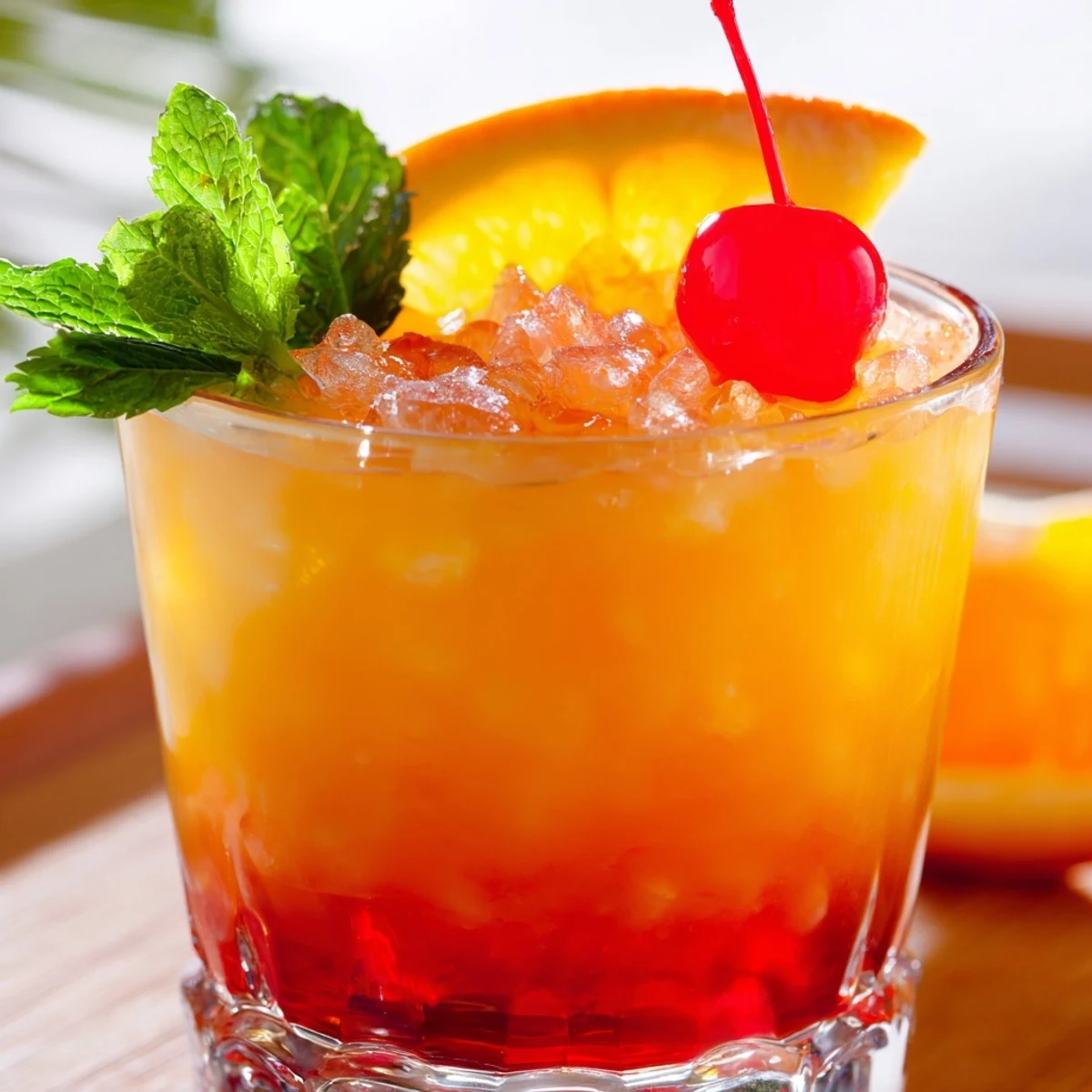 - Crown each drink with an orange slice a maraschino cherry and a fresh mint sprig then serve immediately