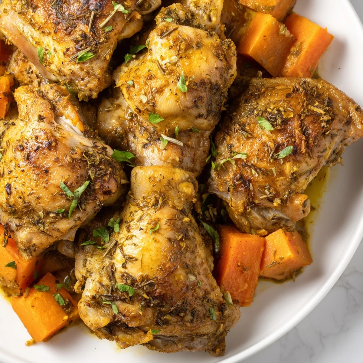 This slow cooker chicken dinner combines bone-in chicken thighs with hearty root vegetables like carrots and potatoes, all simmered in a flavorful herb-infused broth.